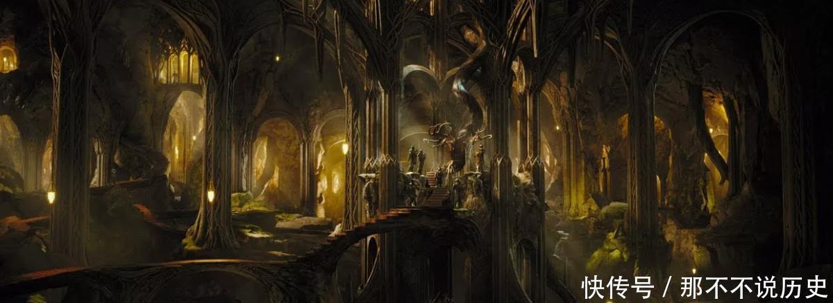 他在高耸的山丘下修建了成片的洞穴与居所,也就是我们在第三纪元末期,比尔博和矮人一行人穿过森林时,在《霍比特人》中见到的那片宫殿。