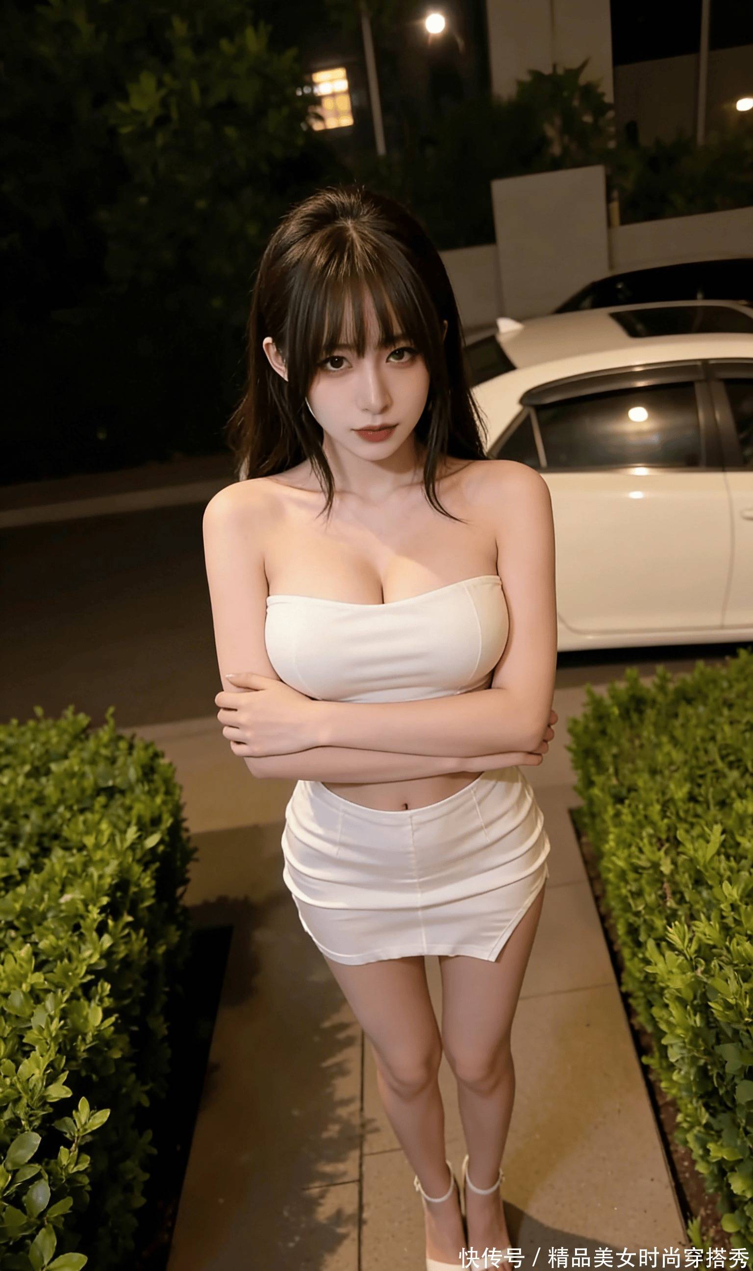 深巷里的暖黄路灯把树影揉成暧昧的光斑,白色跑车的引擎还留着余温,她就这么弯着腰站在车道中央,像一朵在暗夜里骤然绽开的白玫瑰。紧身抹胸把饱满的曲线绷得恰到好处,裙摆斜斜蹭过丝袜边缘,露出一截细腻的大腿。双手虚搭在膝头时,指节泛着薄粉,指尖无意识蹭过光滑的面料,像是在掩饰心底的慌乱,又像是故意把最勾人的细节送到眼前。